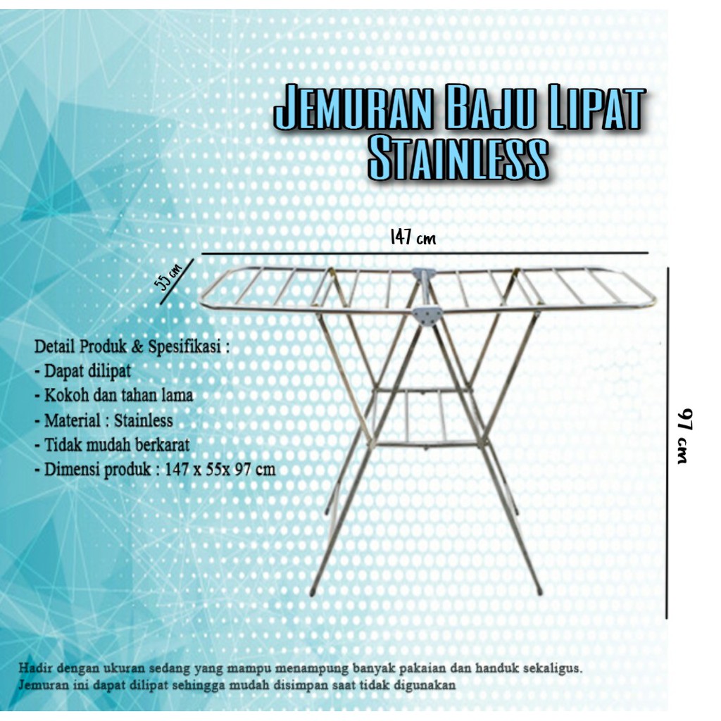 1 from Pertama, jemuran baju lipat stainless memiliki bobot yang ringan, lebih ringan daripada besi. Glory home stainless steel jemuran baju lipat besar/ 12 palang/ 180 cm jemuran berbahan 100% stainless steel yang kuat dan anti karat dengan 12 palangan kokoh. Daftar harga jemuran lipat stainless terbaru mei 2021. Jemuran baju stainless murah ini memiliki ukuran panjang 140 cm, ukuran yang paling pas untuk standar rumah di kota besar. Jemuran baju model lipat memiliki ukuran yang besar, biasanya ditempatkan di halaman rumah, terbuat dari alumunium atau kayu dan bisa dilipat. Jemuran dinding lipat stainless 100 cm,gantungan baju,gantungan,hangerrp200.000: Jemuran lipat stainless 3 susun 100% stainless stell pesan sekarang juga 085216678000,087786278000. 88 x 73 x 150 cm.
